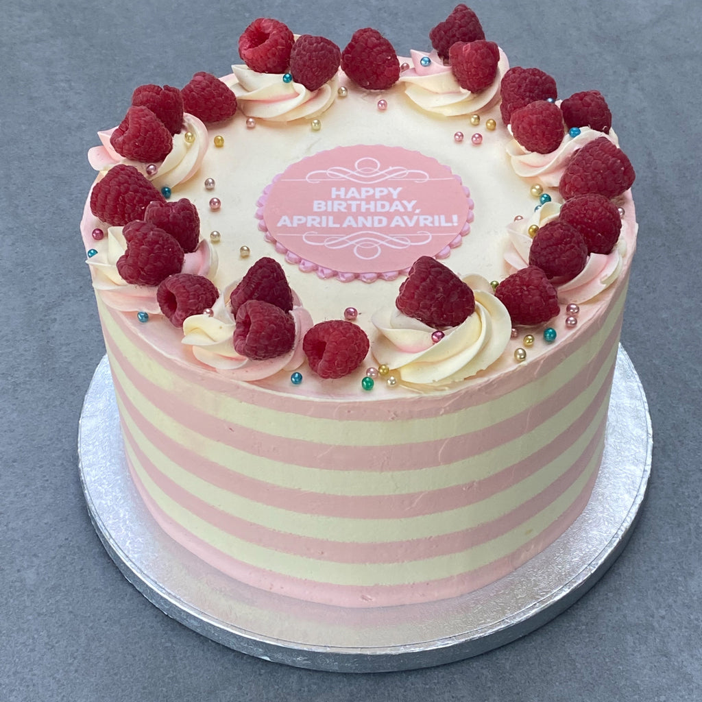 A cake that’s sure to have all your guests looking in awe and admiration! A deliciously light vanilla sponge, encapsulated by a generous coating of smooth velvety vanilla and raspberry buttercream. That’s been striped and piped to perfection! Using a cake comb to create the neatest of lines ready for a contrasting colour of buttercream to be added, giving the cake that exquisite finish. Adorned with buttercream spirals and optional artisanal macarons or fresh ripe raspberries, before being finished with an artistic scattering of sprinkles!