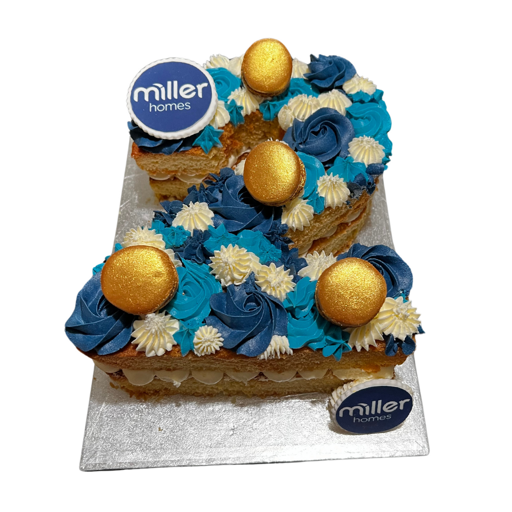 Celebrate your work milestone or anniversary in style with this gorgeous number cake. It's perfect as a centre piece for corporate events and parties, as well as a stunning gift for your team! With an array of toppings to adorn your light vanilla sponge numbers of choice. Choose from either seasonal flowers in your company colours, handmade macarons or rich chocolates, as well as two fondant discs with edible images of your choice. Please either add your images to the drag and drop box or email them to orders@mybaker.co